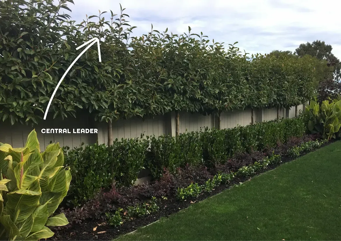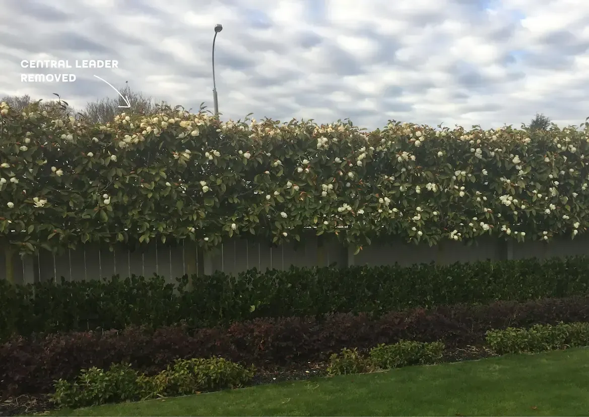 - Once the desired height of your hedge is reached, it’s time to trim the central leader. This will further encourage more horizontal growth, filling the gap between the trees. See images below (the right image displays a flowering hedge during spring).